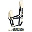 Halsterset met suede-look en bont op neus- en kopstuk en leuke shiny piping, satin finish buckles. Dubbel verstelbaar op het kopstuk en tevens verstelbaar onder de kin. Inclusief bijpassend touw.