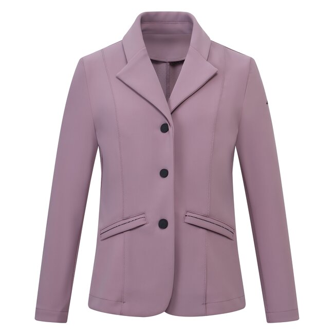 De zeer rekbare stof biedt ultieme bewegingsvrijheid, ideaal voor zowel uitdagende proeven als warming-ups. Het ademende, sneldrogende materiaal met UV-bescherming houdt jonge ruiters koel en beschermd tijdens lange wedstrijddagen. Met elegante kraag en revers, verfijnde merkknoppen en een schitterend strass paardenhoofdlogo op de mouw, is dit wedstrijdjasje een echte blikvanger. Handige ritssluiting onder de knopen en dubbele split zorgen voor optimale pasvorm en comfort in het zadel.