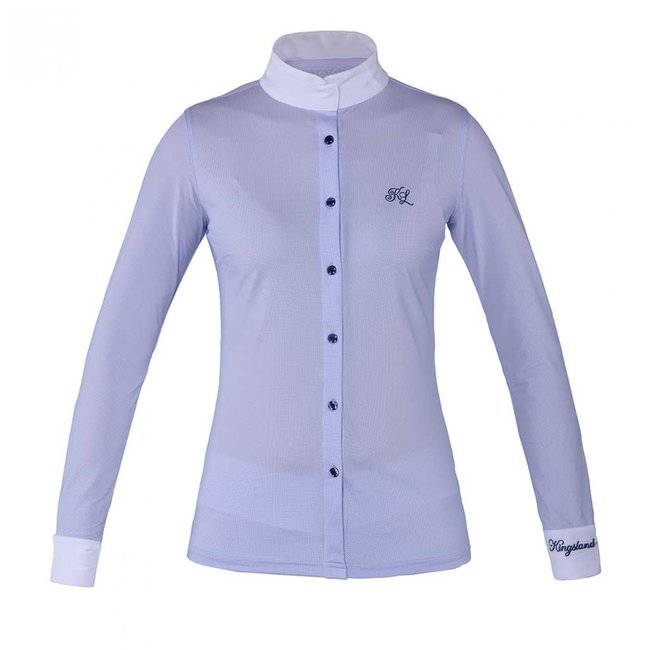 Functioneel showshirt. Vochtmanagement, sneldrogend en ademend materiaal. Logoknopen met kristallen aan de voorkant en aan de manchetten. Kingsland-borduurwerk met kristallen op de linkermanchet. KL borduurwerk met kristallen op de borst. Kroonborduurwerk op middenrugkraag met kristallen.